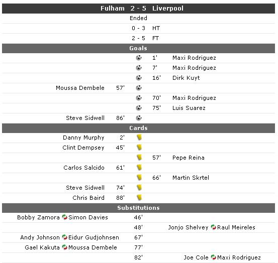 Liverpool will be facing Fulham at Craven Cottage in the English Premier League game on May 9, 2011.Fulham vs Liverpool is a bigger game for the Merseysiders than it is for Fulham. Liverpool are chasing a Europa League spot and a win tonight would see them overtake Tottenham into fifth place. Fulham are in strong form and Mark Hughes will want that to continue despite his team having nothing really to play for. Liverpool have been playing really well since their last couple of match as they beat Birmingham city by 5-0 and then beat Newcastle by 3-0 with amazing partnership and wonderful performance by Dirk Kuyt and Luiz Suraez. Last match between Liverpool and Fulham was played on January 26, 2011 where Liverpool beat Fulham by 1-0.